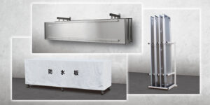 「防水シートⅢ」は、止水高さ1m、最大開口幅8mにまで対応しており、8mの大開口でも1人で5分ほどでセットできます。止水性や機能性に優れつつ、さまざまな施設の景観にも合致するシンプルなデザインも特長です。シートや組み立てに必要な部材が現地下部レール内に収納してあるため、セッティングの際に持ち運びを必要としません。工場や倉庫の浸水・防水対策を万全にしてくれます。